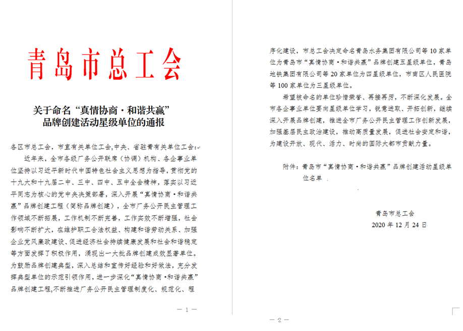 公司在青岛市总工会“真情协商·协调共赢”品牌建设运动中被评定为规范化建设三星级单位